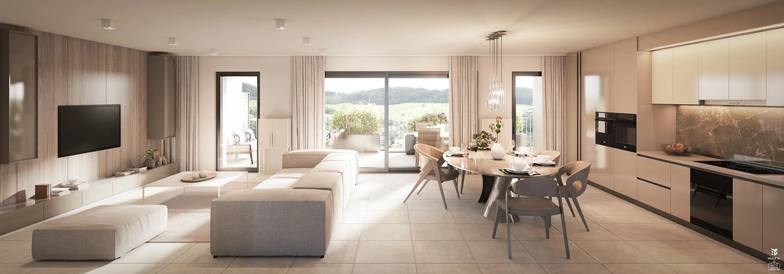 -Wohnzimmer/Küche (25,94 m2) mit Zugang zur Loggia (7,33 m2)